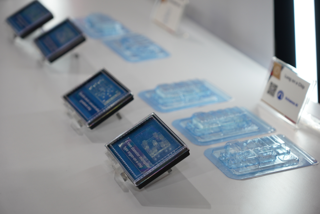國研院展出的前瞻科技實體展品則有兩項:國家地震工程研究中心研發的斜面滾動隔震支承(SRB)及水平振動台,張美瑜主任說明:「 SRB 所具備的抗震能力已實際應用在許多國家,並通過最近幾次地震的驗證,挽救了數十億的經濟損失」;國家實驗動物中心、臺灣儀器科技研究中心與臺灣半導體研究中心共同整合臺灣多項技術優勢領域、與學界共同開發的數種器官晶片,結合微流道裝置、器官微環境模擬、微機電生醫晶片等,是下世代的重要生醫轉譯研究工具,可加速新藥發展,落實精準醫療。