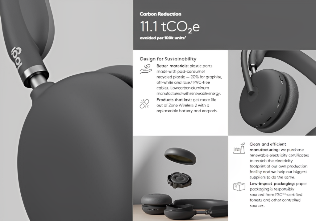 羅技的可持續設計涵蓋了產品的全生命周期管理,從原材料選擇到產品設計、製造、運輸、使用以及最終處置,每一個環節都力求做到環保。例如,羅技的多款產品已達到碳中和並獲得了第三方碳足跡認證,進一步強化了品牌的環保形象。這些努力不僅展現了羅技在可持續設計方面的領先地位,也為整個消費電子行業樹立了新標準: